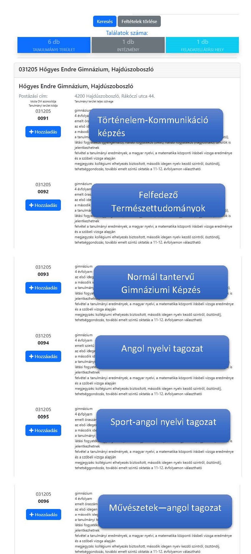 A tanulmányi területek kereséséhez írják be a keresőbe iskolánk OM azonosítóját: 031205
