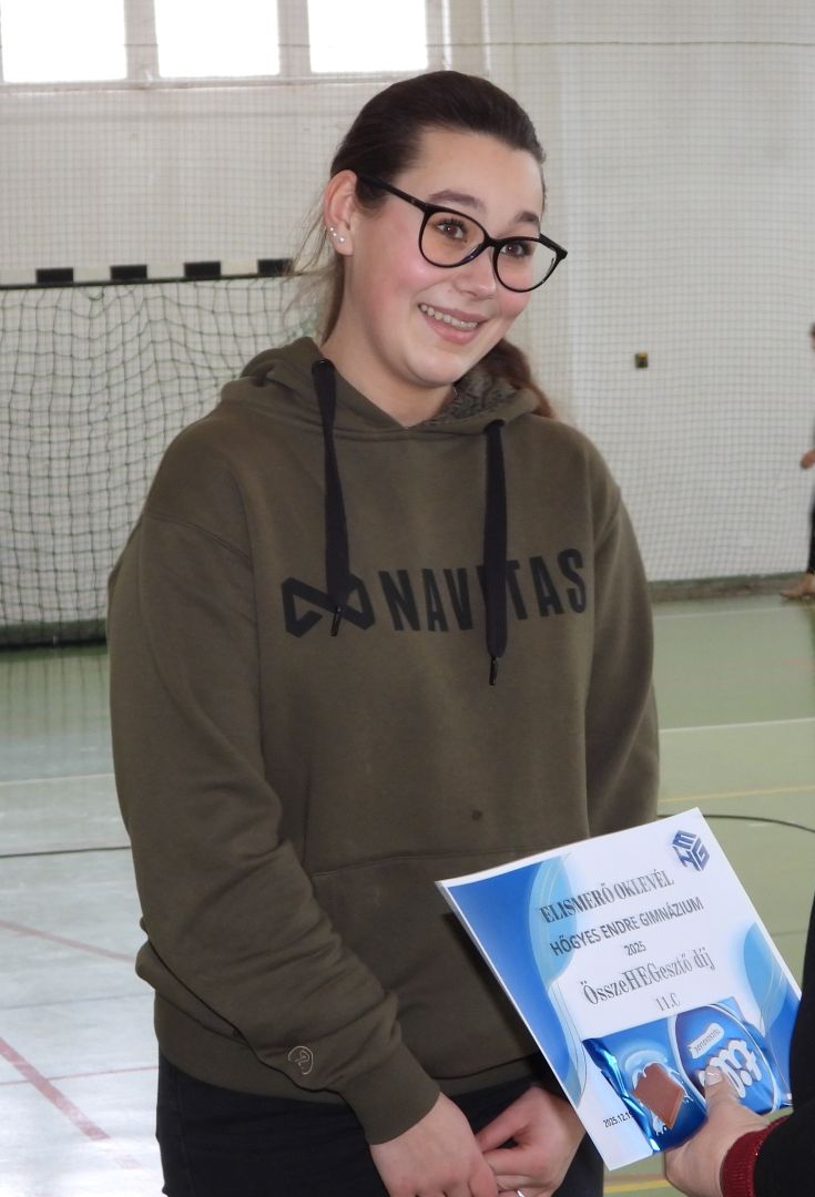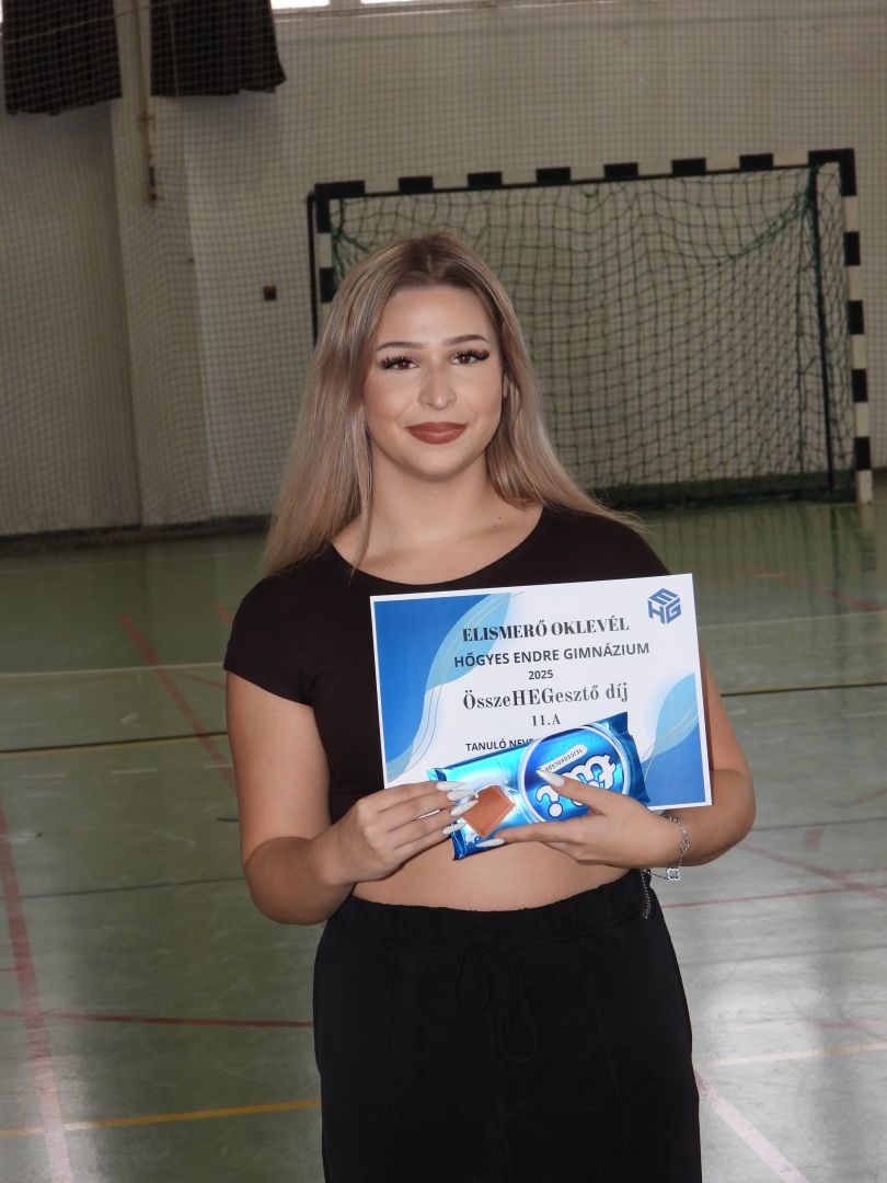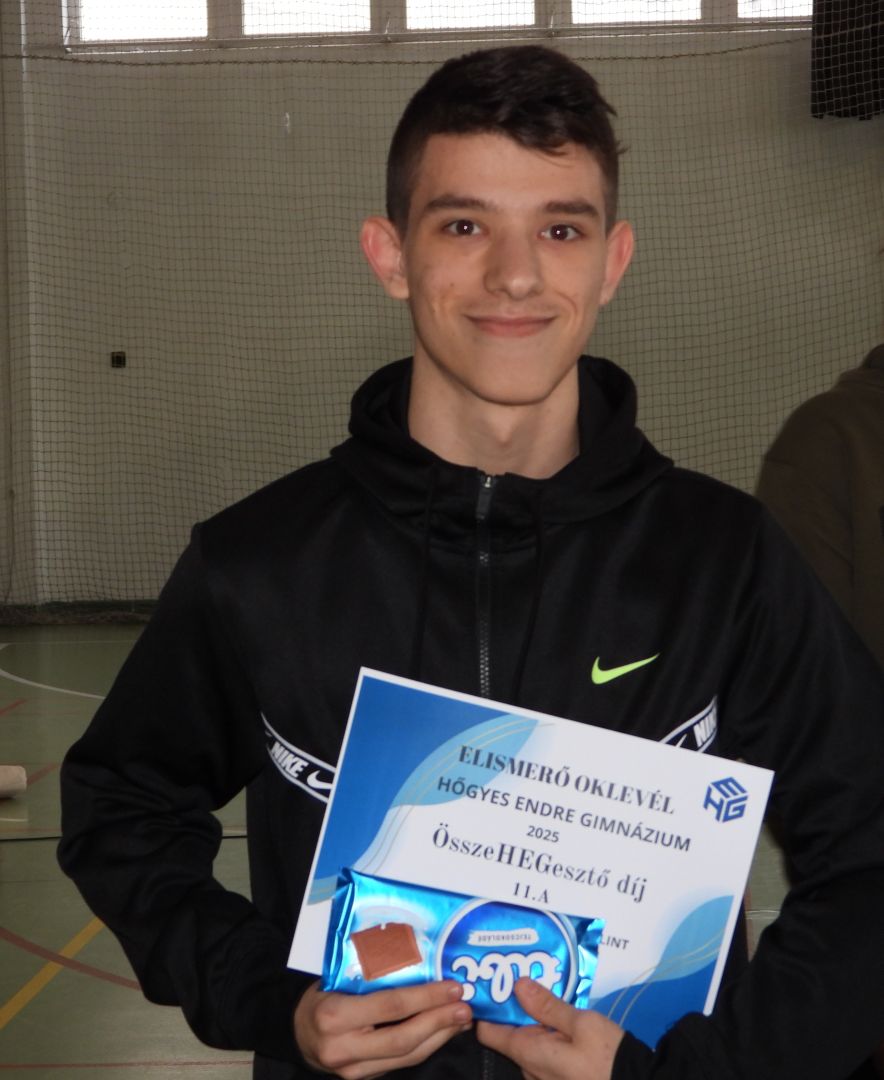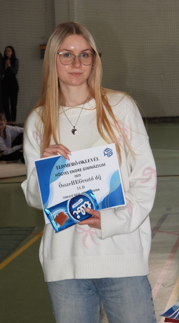 | 11.e | Szatmári Hédi | Ha bármilyen osztályprogramot szervezünk, Hédi szívét, lelkét beleadja a szervezésbe. Kreatív játékötleteivel teszi ezeket a délutánokat még színesebbé, élvezetesebbé és nem csak kitalálja hanem le is vezényli azokat. Kedvessége és nyitottsága révén könnyen teremt kapcsolatokat és szervez közösségi programokat. Köszönöm az osztályért végzett munkáját. |