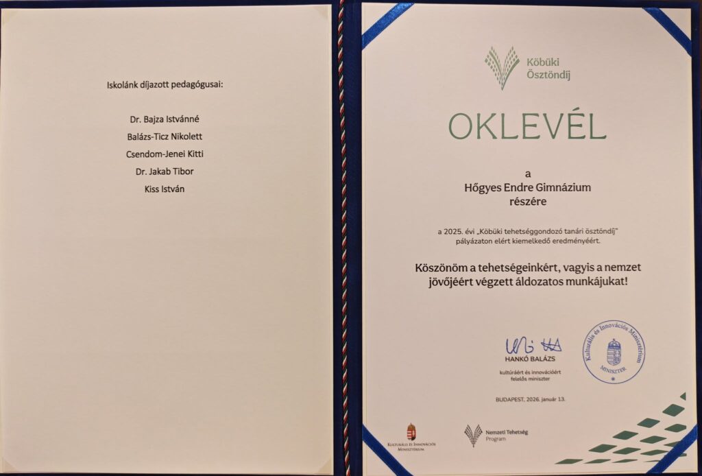 Ünnepélyes keretek között vehettük át az alábbi oklevelet Pósánné Rácz Annamária helyettes államtitkártól. A „Köbüki” Tehetséggondozó Tanári Ösztöndíjpályázaton az elmúlt tanév tehetséggondozó munkája és eredményei alapján öt kollégánk lett nyertes pályázó. Sikereikhez szívből gratulálunk!